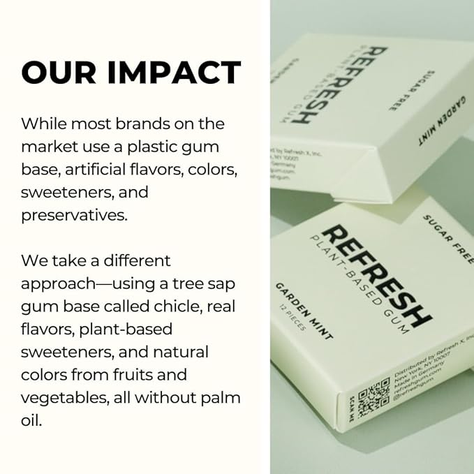 - PLASTIC FREE, PLANT BASED GUM BASE: Refresh Plant Based Gum is made with a natural chicle gum base, free from synthetic plastics and artificial ingredients. Enjoy guilt free chewing that’s better for you and the environment, with real ingredients you can pronounce.