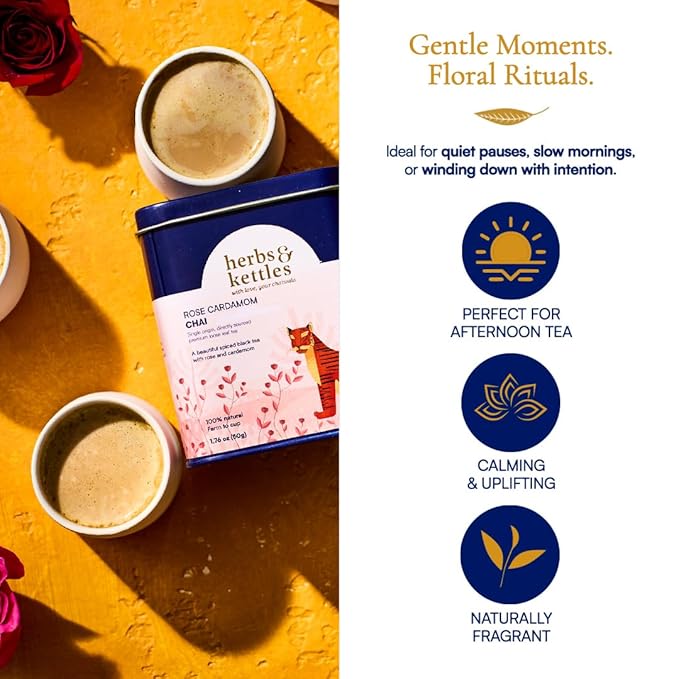 - VERSATILE ENJOYMENT: Herbs & Kettles Rose Cardamom Chai is perfect hot with milk for a creamy rose chai latte, refreshing iced for a cooling floral treat, or added to baking recipes like cookies and cakes for an elevated gourmet twist.