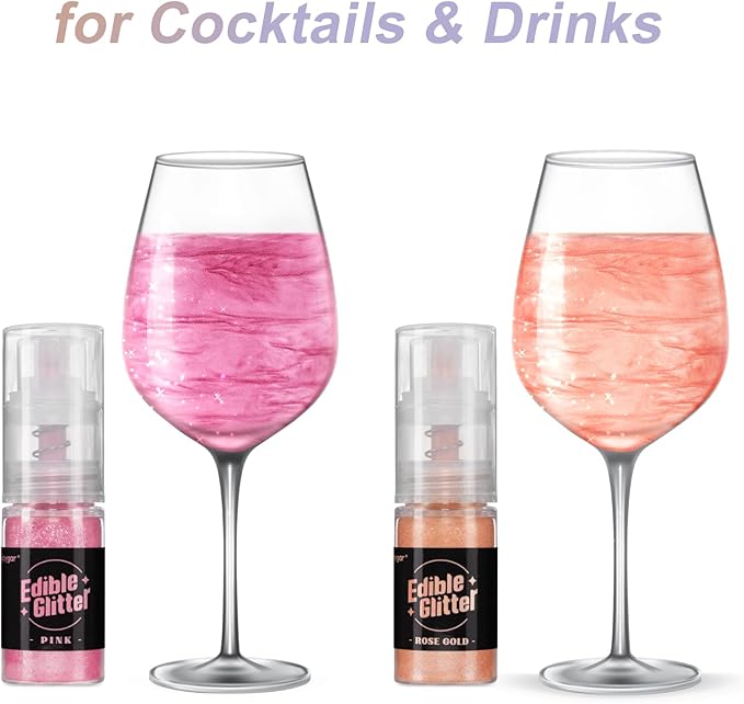 - Edible Glitter for Cocktails: Pink and Rose Gold Edible Glitter Spray is made from Food Grade ingredients, which will not affect the original state taste and the shimmer of the powder makes the food and drink more magical