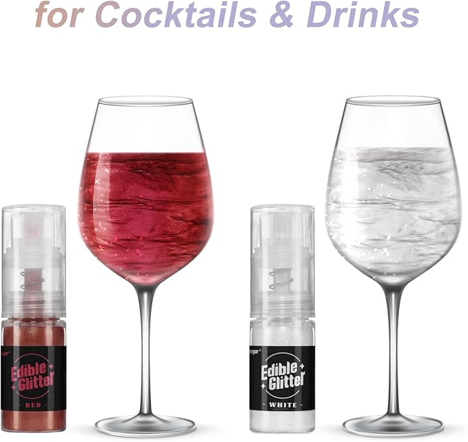 - Edible Glitter for Cocktails: Red and White Edible Glitter Spray is made from Food Grade ingredients, which will not affect the original state taste and the shimmer of the powder makes the food and drink more magical