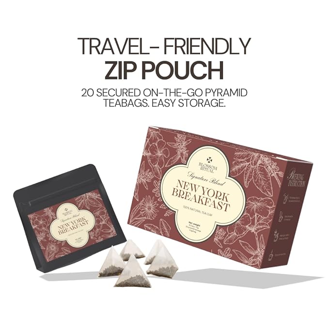 BLOSSOM RITUAL Newyork Breakfast – Strong & Smooth Black Tea with Caffeine – 20 Natural Based Pyramid Bags – Serve Upto 60 cups – Energizing Morning Tea Blend for Focus & Clarity – Resealable Zip Pouch| 2.65oz