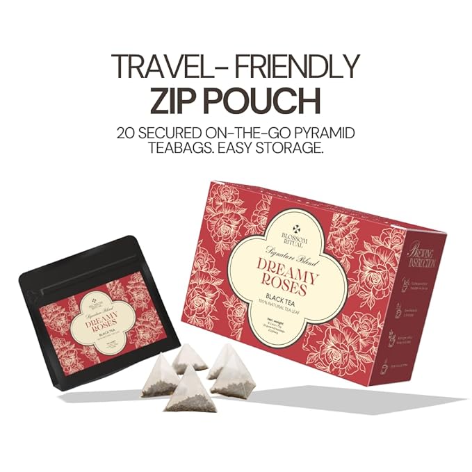 BLOSSOM RITUAL Dreamy Roses – Black Tea Loose Leaf – 20 Natural Based Pyramid Bags – Serve Upto 60 cups – Rose Petal Infused – Boost Focus & Relaxation – Resealable Zip Pouch| 2.65oz