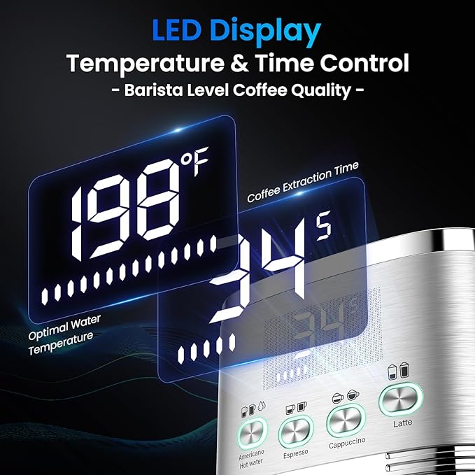 - Latte Machine with LED Display & ESE Pod Compatible: URintells Cuising expresso machines for home with the intuitive time and temperature display, which can clearly show the time of coffee extraction and water temperature brewing progress. 198℉ is the optimal temperature for coffee extraction. Our cappuccino machines for home with stainless steel single and double shot filters, ESE pod filter. ESE pod filter is easier to use and clean. Making coffee has never been easier with a americano coffee machine