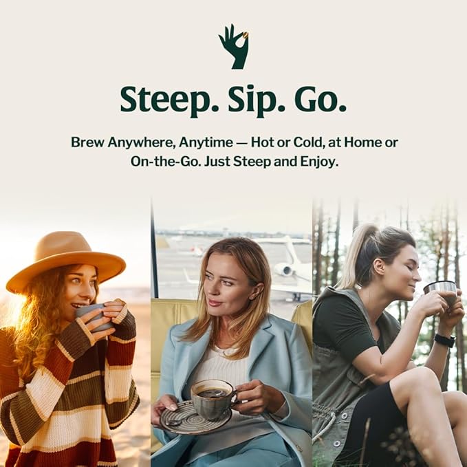 - BREW ANYWHERE, ANYTIME – NO EQUIPMENT NEEDED: No machines, pods, or gear required. Just drop the compostable coffee bag into hot water for a rich, gourmet brew in minutes—perfect for home, travel, outdoors, or the office.