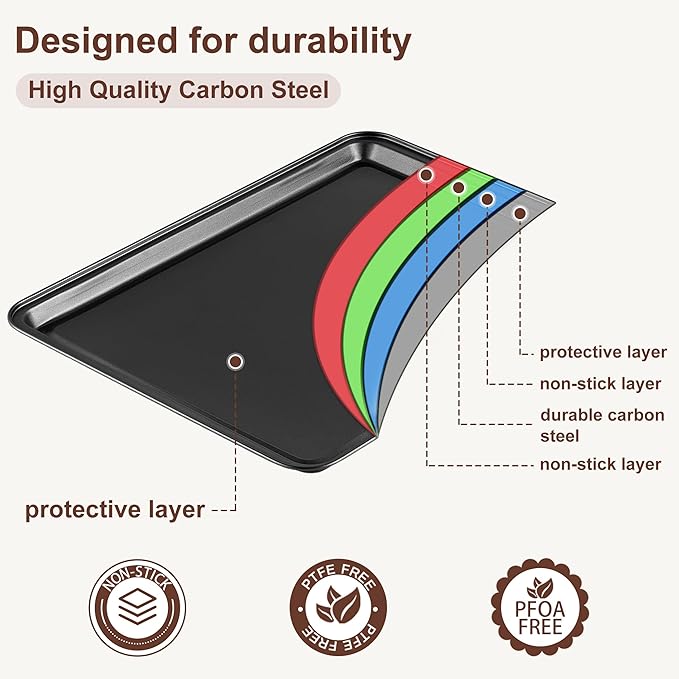 - [Thoughtful & User-Friendly Design] Enjoy kitchen convenience with our designed bakeware collection. This baking pans set features sturdy, riveted handles for a secure and safe grip. The stackable design allows neat storage, saving cabinet space while keeping your kitchen organized. Whether baking muffins or preparing feasts, this baking set makes every step smoother