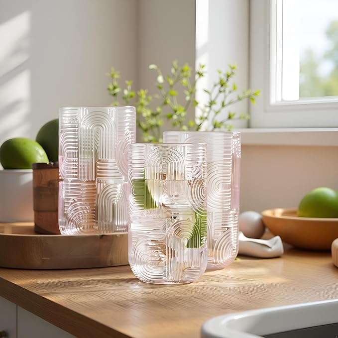 - 🍹ELEGANT DESIGN: Transparent pink glassware featuring sophisticated geometric patterns with ribbed U-shaped designs etched on the exterior surface for style and grip. The modern design complements any table setting or special occasion. Tumblers are 17 oz each, perfect for smoothies, soda, water, juice, cocktails, or any other cool beverage.