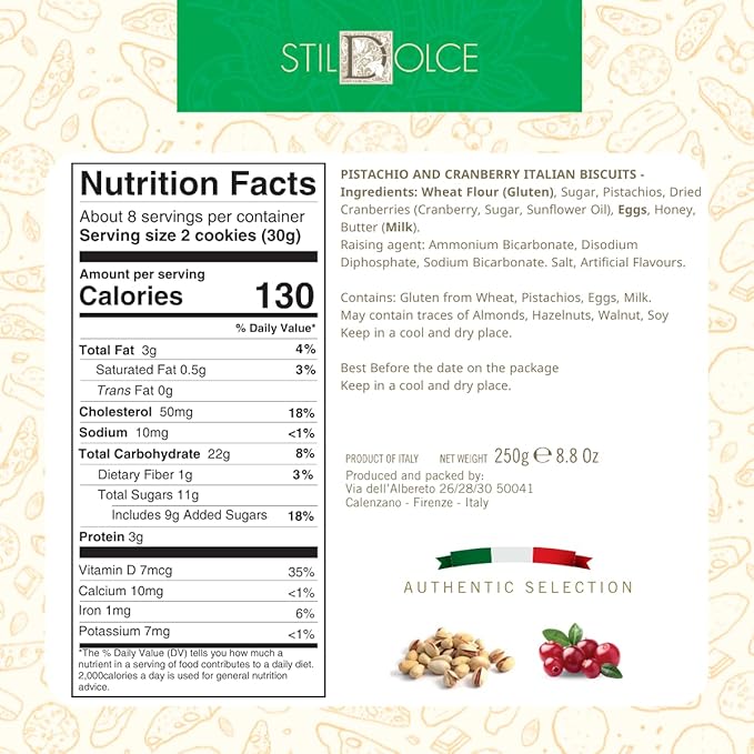 Stildolce Semi-Soft Pistachio and Cranberry Italian Biscotti Cookies| Made in Tuscany, Italy| Classic Gourmet Biscuits No Preservatives 8.8 Oz, Pack of 2