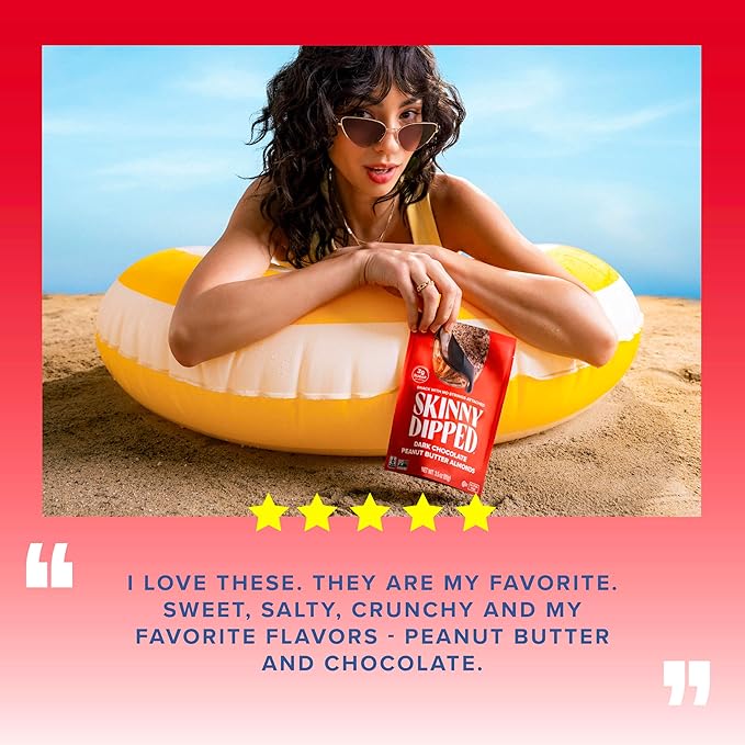 - PERFECT PORTIONS: Each bag has 170 calories and is sized to be the ideal on-the-go snack for Kids and Adults. This pack includes (15) individually wrapped 1.2 oz bags of SkinnyDipped Dark Chocolate Peanut Butter Almonds.