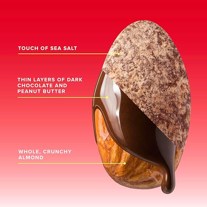 - SALTY, SWEET & PEANUT-BUTTERY: Whole roasted almonds, kissed with maple sugar and sea salt, SkinnyDipped in a thin layer of dark chocolate and finished with a hint of peanut butter.