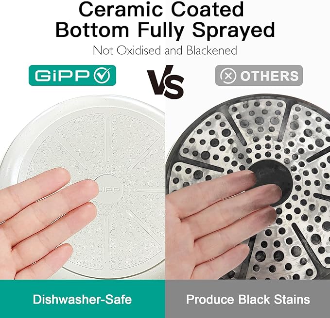 - 100% Non-Toxic & Healthy - Made with a healthy ceramic coating free from PTFE, PFAS, PFOA, PFOS, APEO, lead, cadmium and SGS Approved. GiPP ceramic Pots and Pans Set is safe for your family and the environment