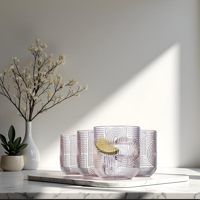 - 💖ELEGANT DESIGN: Art Deco-inspired embossed pattern featuring geometric lines and architectural elements adds sophisticated style to these pink glass tumblers