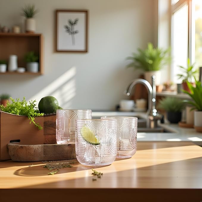 - 💪PERFECT SIZE: Each tumbler holds 13.2 ounces (390ml), ideal for serving water, juice, cocktails, smoothies, whiskey, bourbon, vodka scotch mixed drinks or any favorite beverage. Made from durable clear glass with embossed textural details that provide both visual interest and secure grip