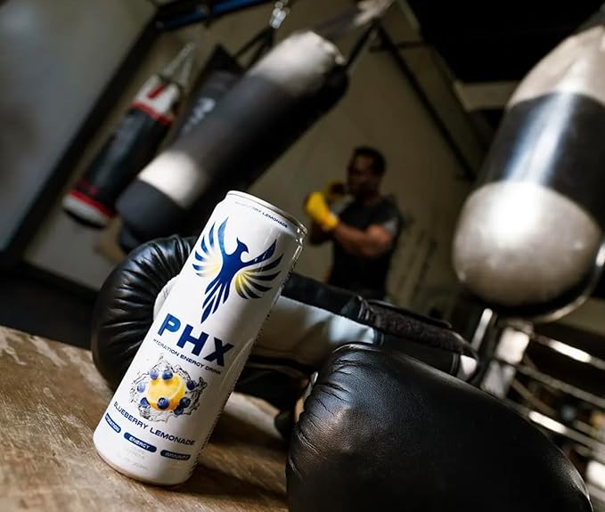 PHX Hydration Energy Drink - 700mg Electrolytes, 200mg Natural Green Tea Caffeine, 100% Daily Value 8 Essential Vitamins - 12 oz Cans (12 Pack) (12 Pack, Blueberry Lemonade)