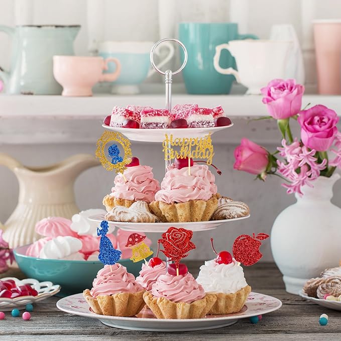 - Princess Cake Decoration: This set includes 24 (red blue gold) cupcake toppers with apple, rose, mushroom house, magic mirror, princess, and "Happy Birthday" designs. Perfect for cake and snack decorations