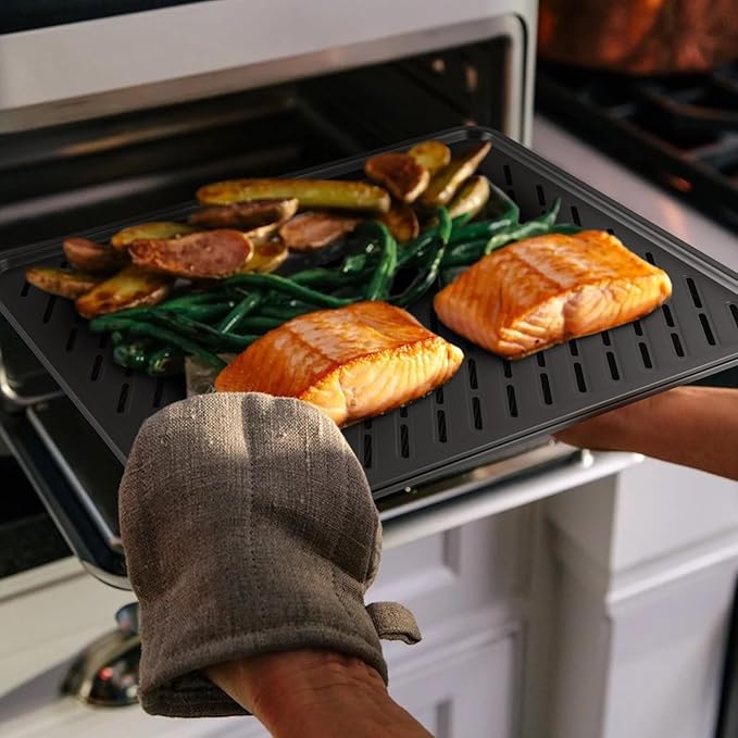 - Premium Thickened Material: No More Warped Pans! The reinforced steel edges of the baking tray also significantly improve its overall durability. Heavy-duty 0.8mm carbon steel withstands 450°F heat without bending – perfect for crispy bacon, giant cookie batches, and sizzling sheet pan dinners