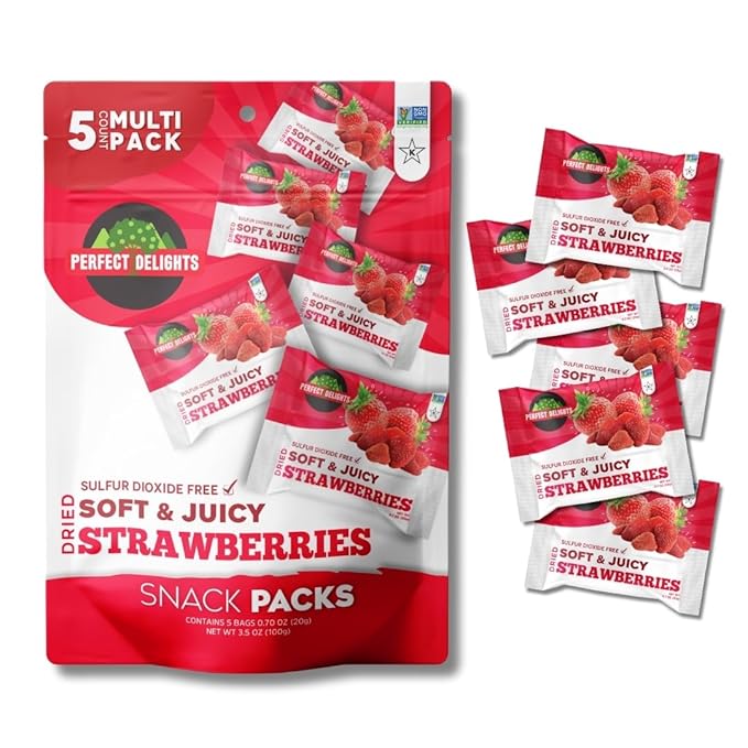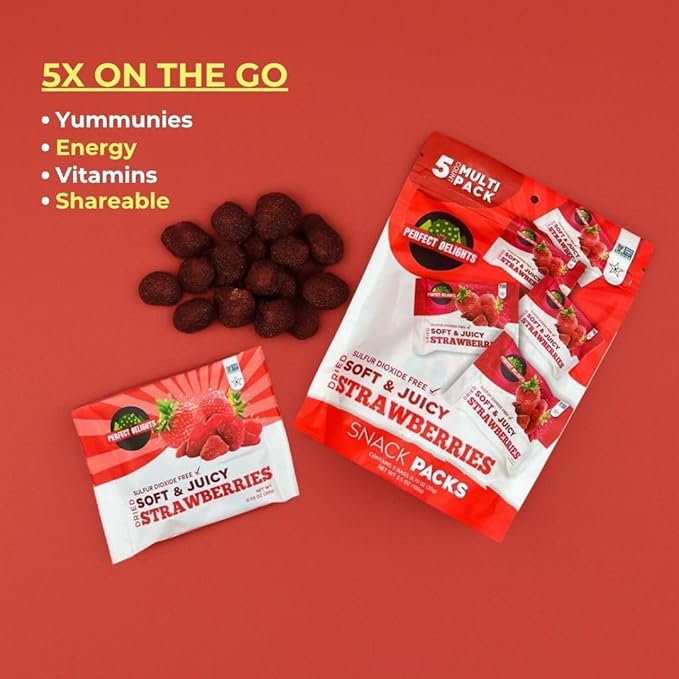 Perfect Delights Snack Pack Strawberries, Sun-Dried Strawberries, On-the-Go Vegan, Healthy Snack, Easy-to-Carry Dried Strawberries, Perfect for Kids & Adults - 5 Pack