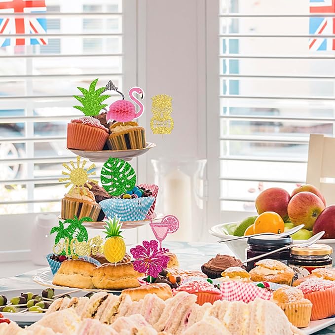 30 Pack Tropical Cupcake Toppers Glitter Leaf Pineapple Palm Tree Flamingo Picks Aloha Luau Cake Decorations for Summer Baby Shower Birthday Party Supplies
