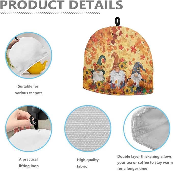 Gnome Pumpkins Tea Pot Cover for Halloween Day Reusable Teapot Cozy Keeping Warm,Dust Proof Maple Leaves Teapot Dust Protector for Kitchen Decorative