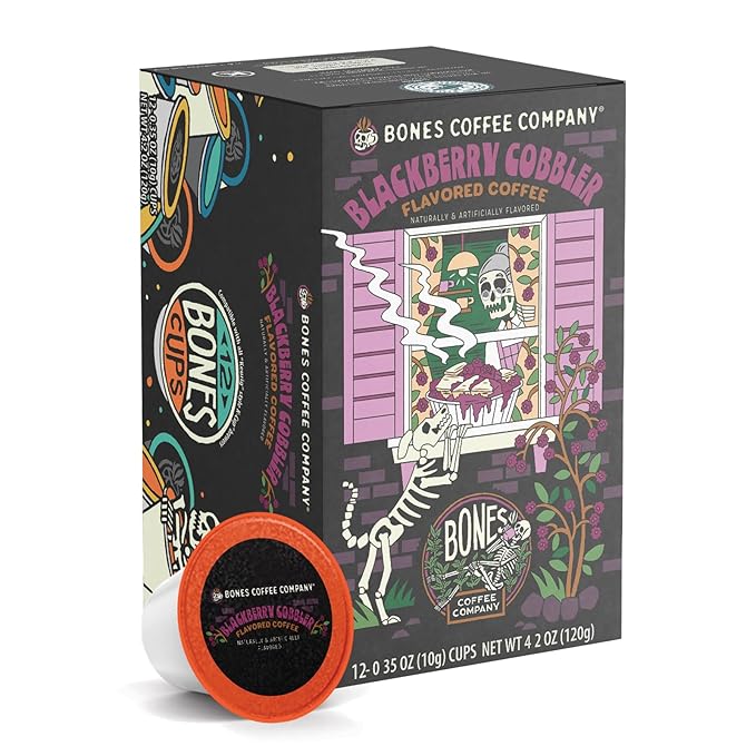 Bones Coffee Company Blackberry Fruit Cobbler Flavored Coffee Pods, Low Acid Medium Roast Single-Serve Bones Cups, Compatible with 1.0 & 2.0 K-Cups Brewers Coffee Maker, 12 Count
