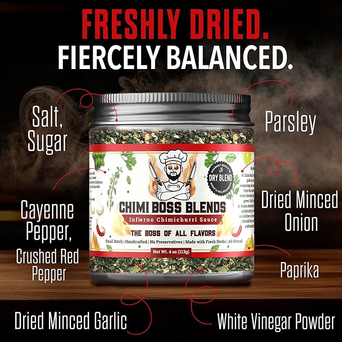 - THE DRY CHIMI THAT BRINGS THE HEAT: Infierno is our fiery twist on chimichurri seasoning—bold herbs, real garlic, and red chili flakes bring smoky, spicy flavor to anything you’re cooking.