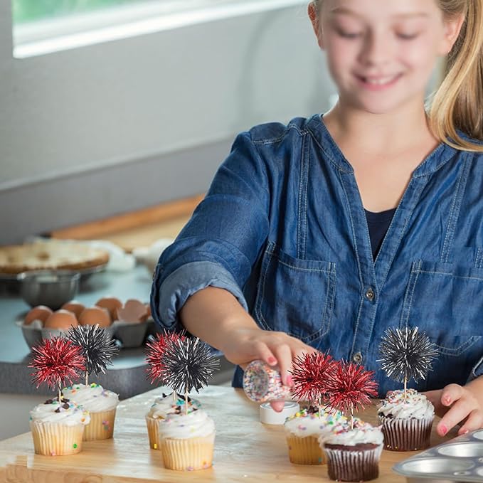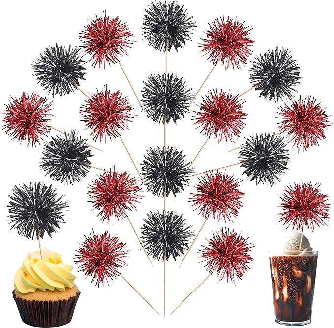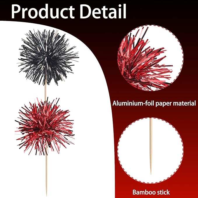 40 PCS Foil Firework Cupcake Toppers Sparkle Tinsel Cupcake Picks Fireworks Birthday Party Decorations Cocktail Fruit Toothpick for Birthday Wedding Graduation Party Decorations Supplies Black Red