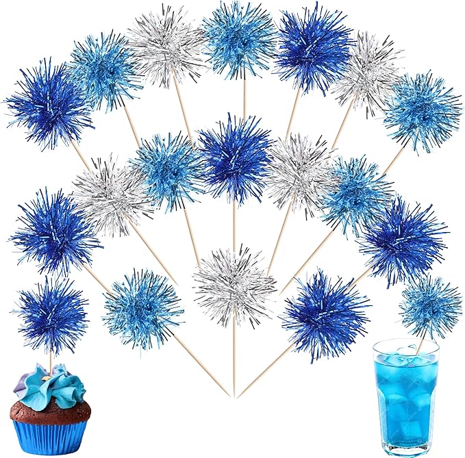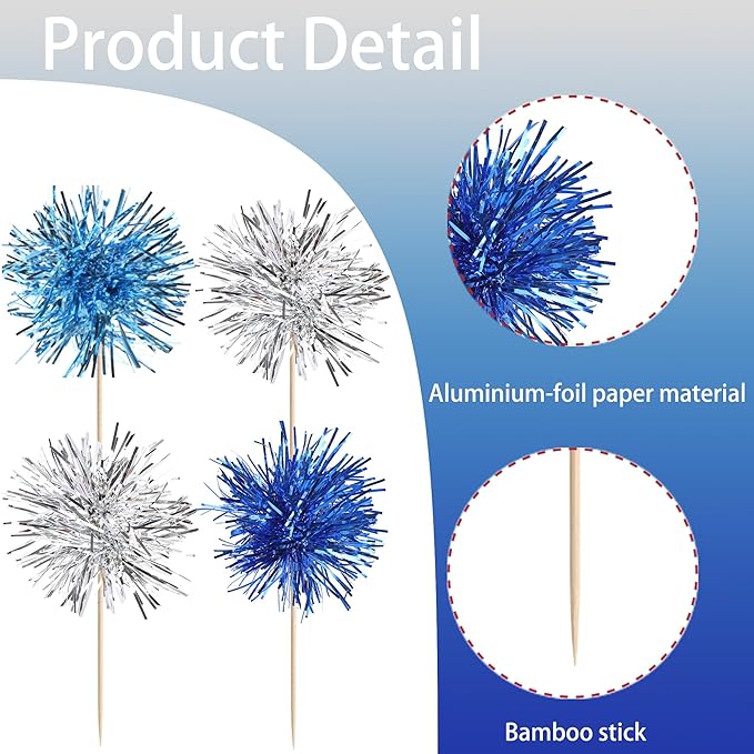 30 PCS Foil Firework Cupcake Toppers Sparkle Tinsel Cupcakae Picks Foil Firework Decorations Cocktail Fruit Toothpick for Fireworks Theme Birthday Wedding Graduation Party Decor Blue Silver Light Blue