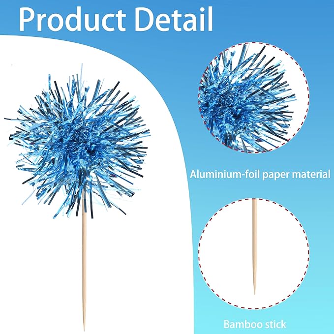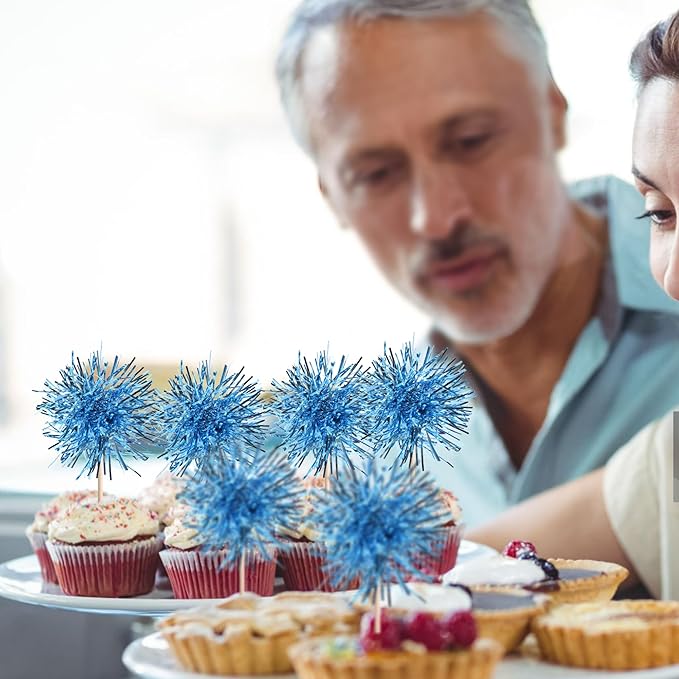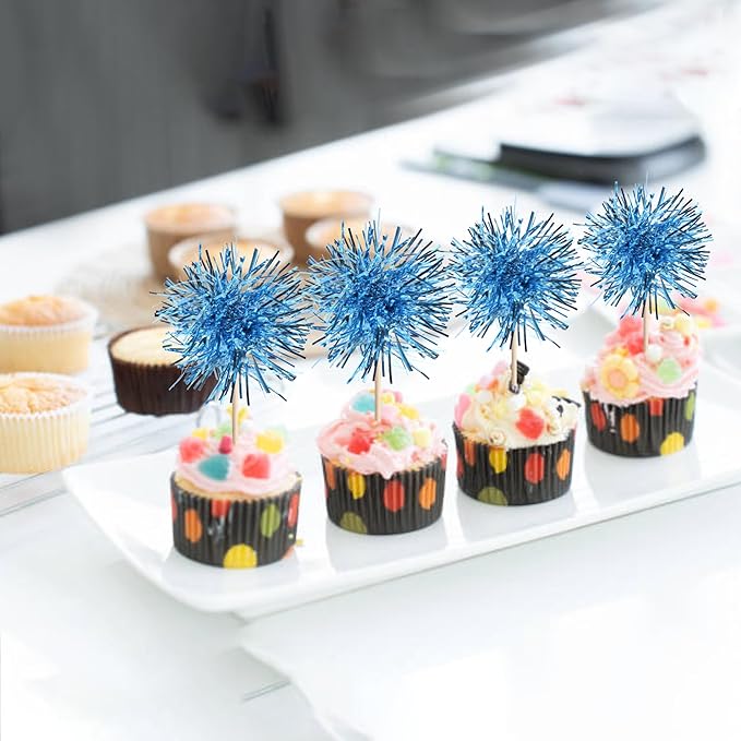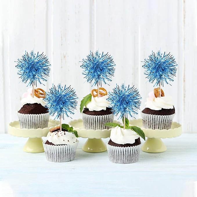 40 PCS Foil Firework Cupcake Toppers Light Blue Sparkler Cupcake Picks Sparkle Tinsel Fireworks Decorations Cocktail Fruit Toothpick for Firework Theme Birthday Wedding Graduation Party Decor Supplies