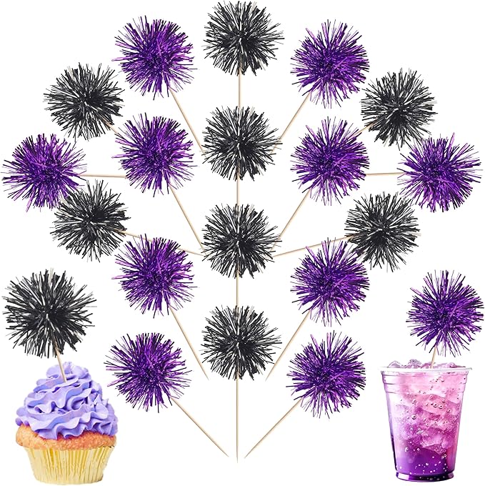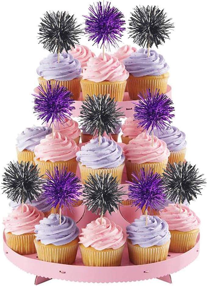 40 PCS Foil Firework Cupcake Toppers Sparkle Tinsel Cupcake Picks Fireworks Birthday Party Decorations Cocktail Fruit Toothpick for Birthday Wedding Graduation Party Decorations Supplies Black Purple