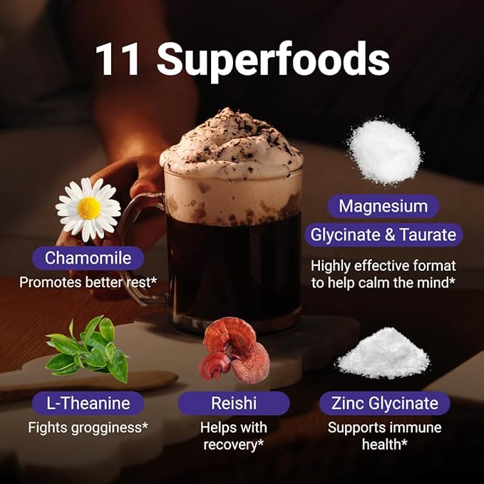 - Powerful Superfoods & Adaptogens: Formulated with 11 superfoods including L-theanine, zinc glycinate, reishi mushroom and chamomile to help calm the mind, support gut health, and promote high-quality rest.