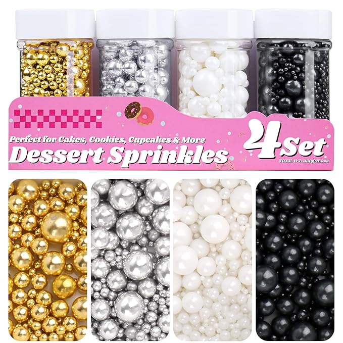 - 【Four Colors in One Set】Includes 4 jars different colors of edible pearl sprinkles (white, gold, silver, black), perfect for all baking needs, bake like a pro with just one set