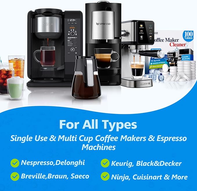 - Works on All Brands:Compatible with all brands including Breville, Kuerig, Nespresso Vertuo, Philips, Urnex, Moccamaster, Affresh, Kurig, Zojirushi, Verismo, Cuisinart, Oxo, De Longhi, biocaf, Kitchen aid and more