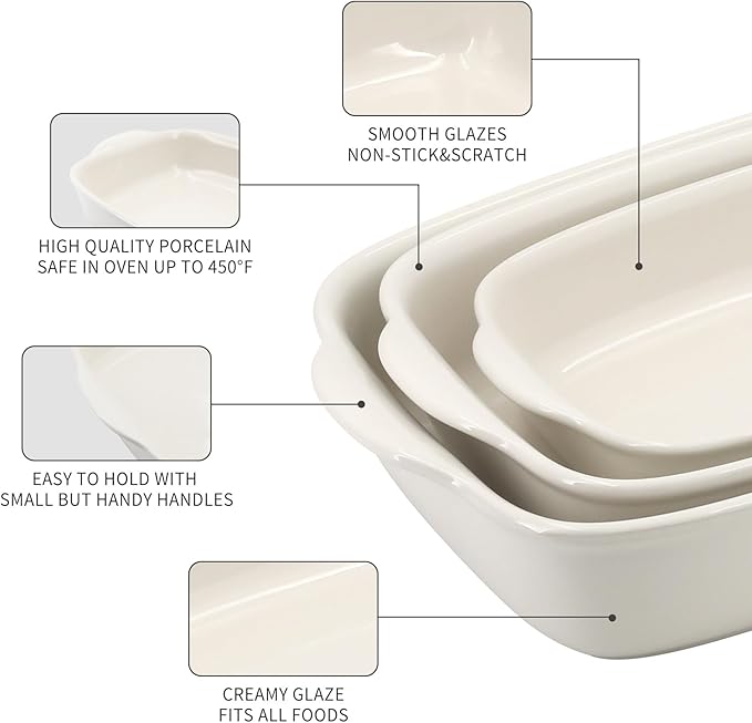 3-Pack Ceramic Baking Dishes Set,Heavy-Duty Oven-Safe Stoneware,Deep Rectangular Casserole Pans for Lasagna & Baking,High Heat Resistant,Handcrafted Glazed Finish (13.8''/12''/9.6'' Pure Off-White)