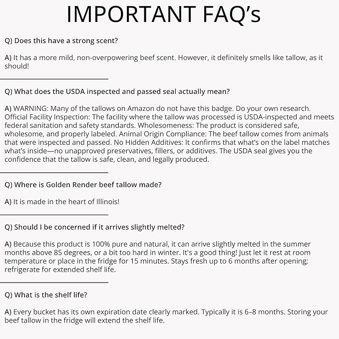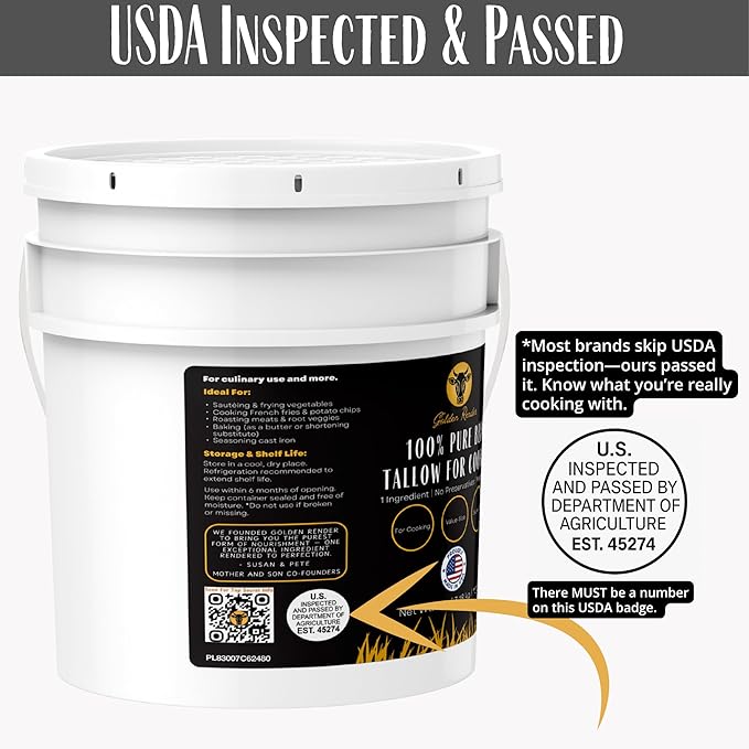 - USDA Inspected & Passed - Officially inspected and approved by the U.S. Department of Agriculture. Beware of many other tallows that do not have this badge on their label. Who knows what you're getting...Golden Render is proudly rendered and packaged in America for trusted quality and freshness.