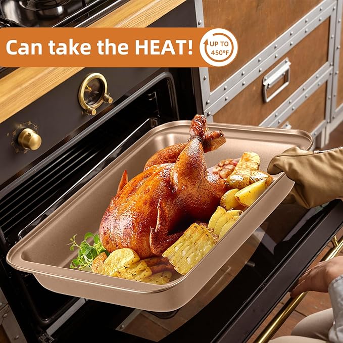 - 【PREMIUM CARBON STEEL CONSTRUCTION】Built with heavy-duty carbon steel, these pans resist warping, bending, and rust, even under extreme temperatures up to 450°F. The robust material ensures even heat distribution for perfectly baked goods every time, while its scratch-resistant design guarantees longevity. Whether you’re roasting a chicken or baking a delicate cake, these pans deliver professional-grade performance that withstands years of daily use.