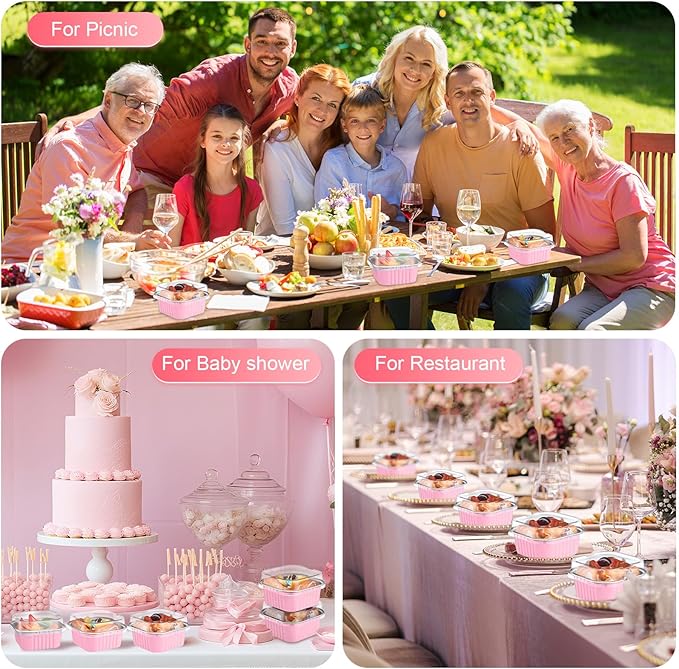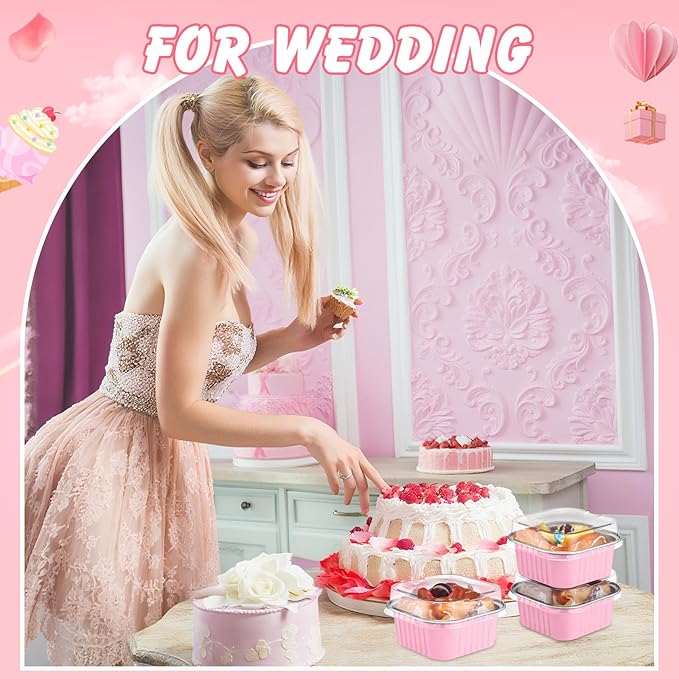 - Suitable Capacity: each cupcake container measures about 3.5 x 3.5 x 1.5 inches/ 9 x 9 x 3.8 cm, has a capacity of 5 ounces, and comes with a matching transparent lid; These cups have an elegant appearance, with a pink outer layer and a silver inner layer