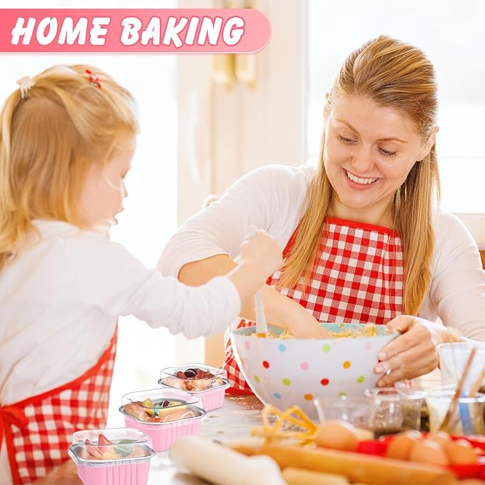 200 Pack 5 oz Square Baking Cups with Lids Aluminum Foil Mini Cake Pans with Lids Disposable Ramekins Tins Dessert Containers Cupcake Pans for Souffle Home Wedding Birthday Party Picnic (Pink)