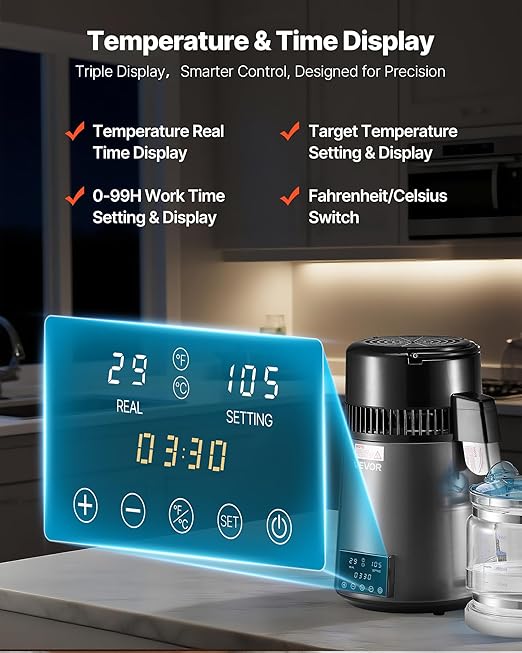 - High-Quality Materials: The distilled water maker features a 304 stainless steel interior water tank. The container is made of high borosilicate glass, with all parts in contact with water being of food-grade materials