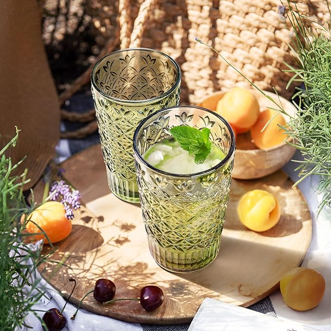Joeyan Green Vintage Drinking Glasses,Embossed Water Glass Cups,Colored Highball Glass Tumblers,Decorative Elegant Glassware Cups for Beverages Juice Cocktail Beer,14 oz,Set of 4,Dishwasher Safe