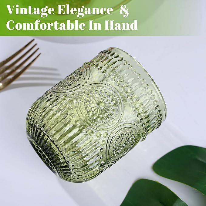 Joeyan Vintage Drinking Glasses Set of 4,9 oz Green Embossed Sunflower Small Water Glass Tumbler Cups,Colored Romantic Beaded Glassware for Beverages Cocktail Juice Wine,Dishwasher Safe