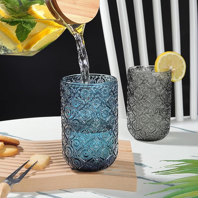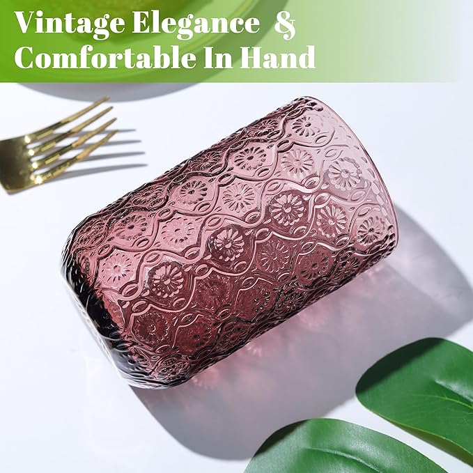 - Elegant Design: Our glass tumblers set of 4 has a unique embossed design, retro and elegant with texture. Combined with the color design, novel and stylish, add a touch of vintage-inspired style to any occasion.