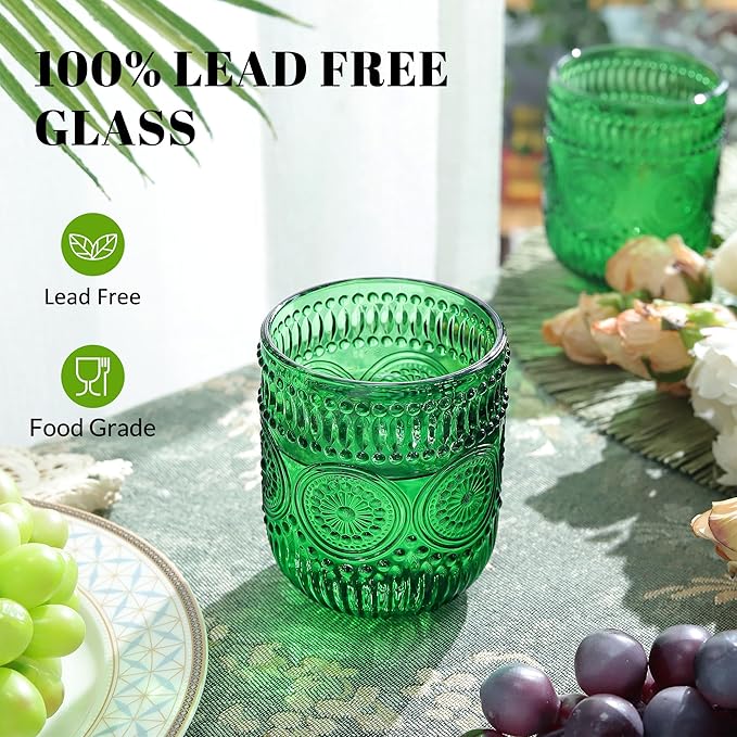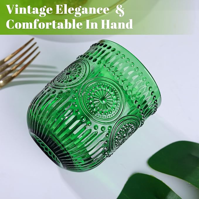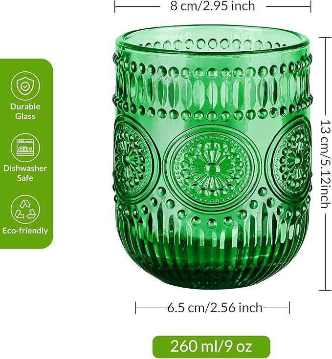 Joeyan Vintage Green Drinking Glasses Set of 4,9 oz Embossed Sunflower Small Water Glass Tumbler Cups,Colored Romantic Beaded Glassware for Beverages Cocktail Juice Wine,Dishwasher Safe