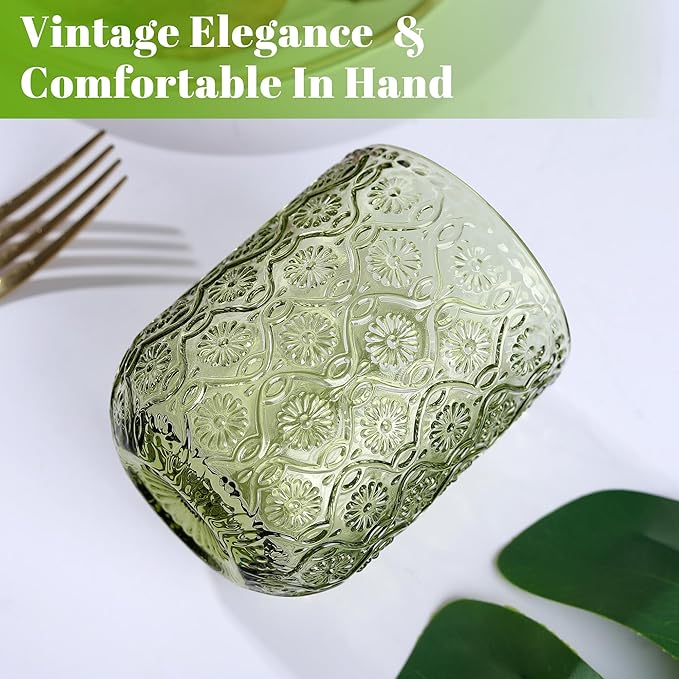 Joeyan Small Green Drinking Glasses,Vintage Embossed Floral Water Glass Tumbler Cups,Colored Beverages Cocktail Juice Wine Glassware,9 oz,Set of 4,Dishwasher Safe