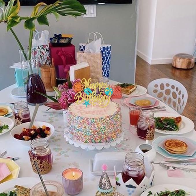 Rsstarxi 1 Pack Summer Beach Happy Birthday Cake Topper Slippers Sun Umbrella Starfish Summer Pool Cake Pick for Hawaiian Holiday Pool Theme Birthday Party Cake Decorations Gold