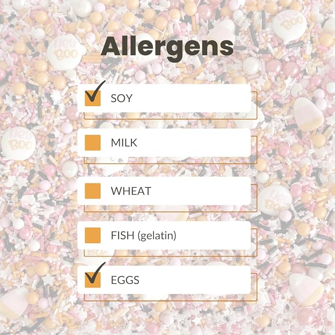 - Halloween Sprinkle Mix with Royal Icing Pieces – Includes a vibrant blend of orange, pink, black, white, and gold sprinkles with approximately 12 royal icing additions including smiling ghosts, pastel candy corn, and “Hey Boo” discs. Perfect for decorating Halloween cupcakes, cakes, cookies, cake pops, and more