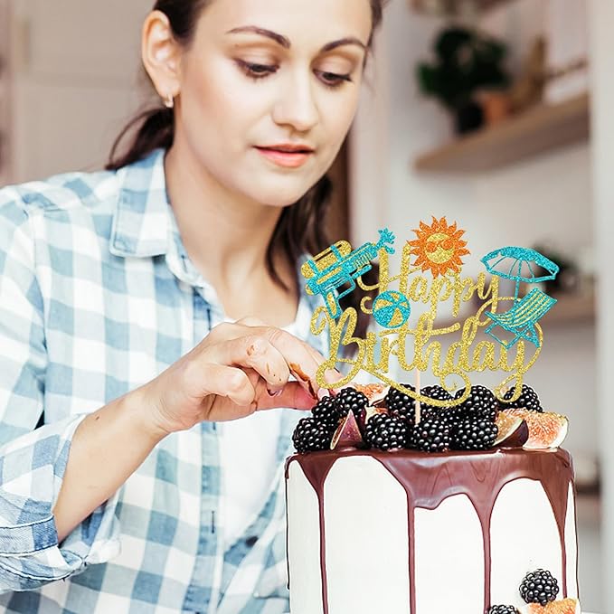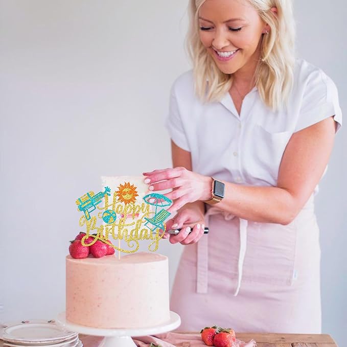 1 Pack Summer Beach Happy Birthday Cake Topper Tropical Hawaiian Water Gun Cake Pick Glitter Umbrella Pool Holiday Cupcake Decoration for Summer Baby Shower Birthday Party Supplies Gold