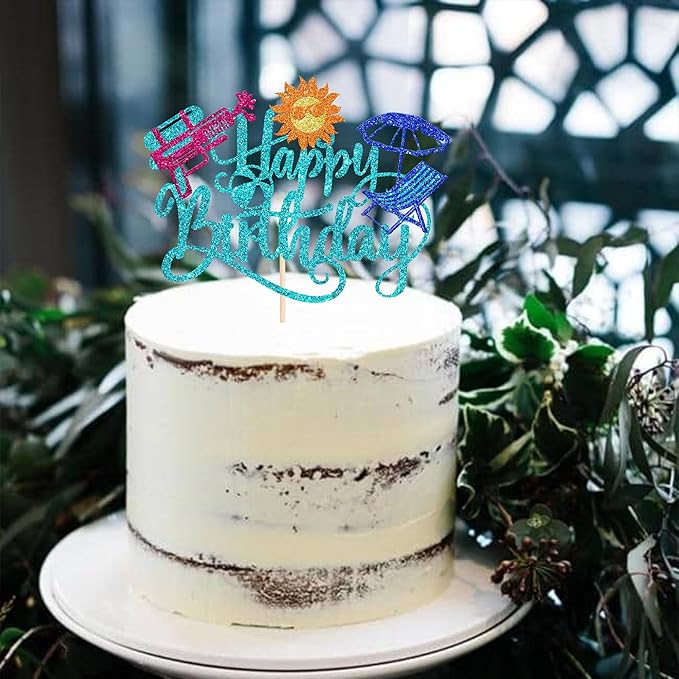 1 Pack Summer Beach Happy Birthday Cake Topper Tropical Hawaiian Water Gun Cake Pick Glitter Umbrella Pool Holiday Cupcake Decoration for Summer Baby Shower Birthday Party Supplies Blue