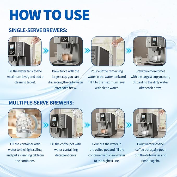 - Universal & Safe for All Coffee Makers:Ideal for single-serve, multi-cup, pod brewers, and espresso machines. These coffee pot cleaner tablets are made with gentle powerful ingredient blend that cleans deeply without harming internal components or leaving residue