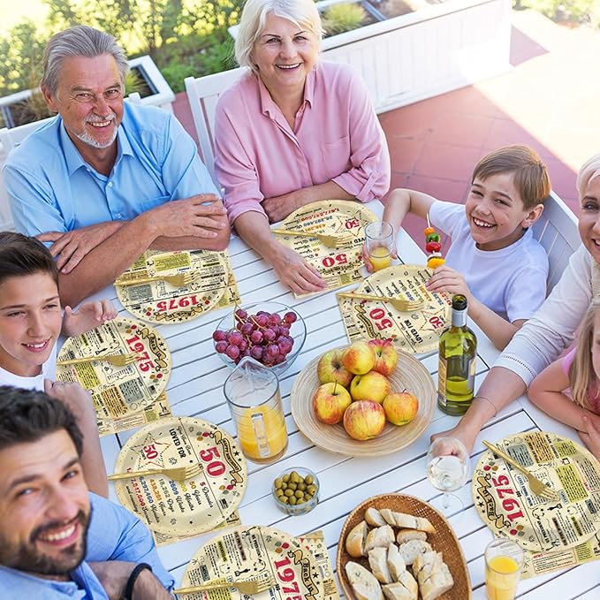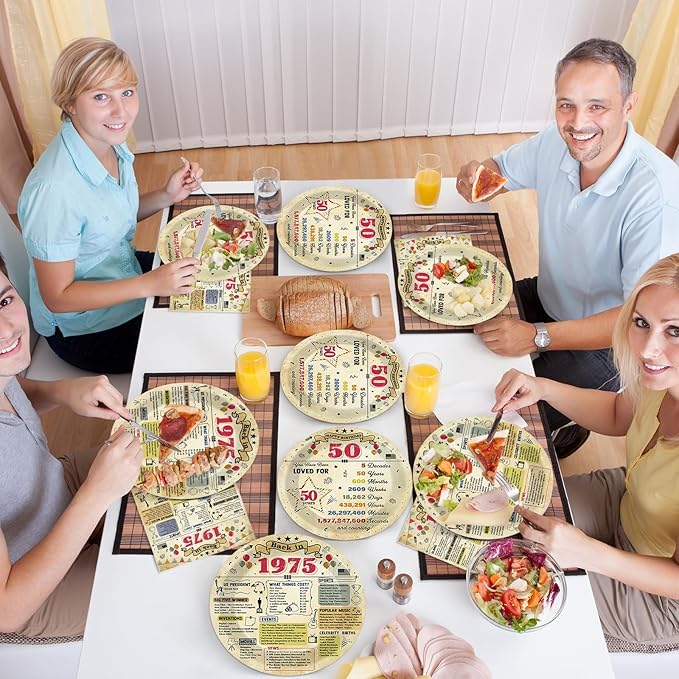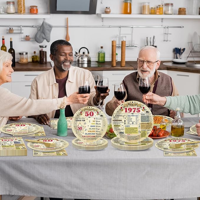 - Retro and Elegant Design: Featuring a unique "Back in 1975" vintage theme, the cheer to 50 plates and napkins are adorned with retro-style typography, historical highlights, and fun design elements that evoke memories of the year 1975. The muted gold and vintage color palette combined with elegant accents ensures your 50th birthday tableware set stands out while complementing any vintage birthday party decor