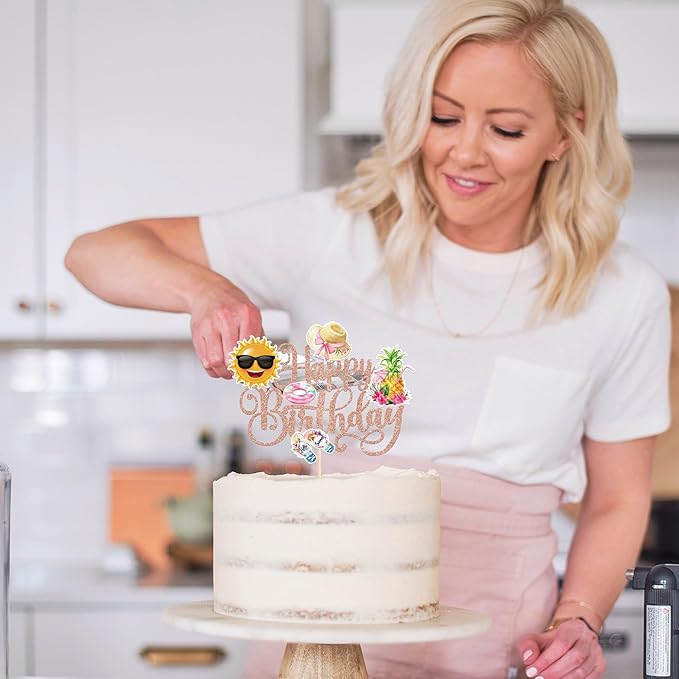 1 PCS Summer Beach Happy Birthday Cake Topper Glitter Sun Flip-Flops Pineapple Flatator Hat Cake Pick Pool Birthday Cake Decorations for Tropical Hawaiian Luau Baby Shower Party Supplies Rose Gold