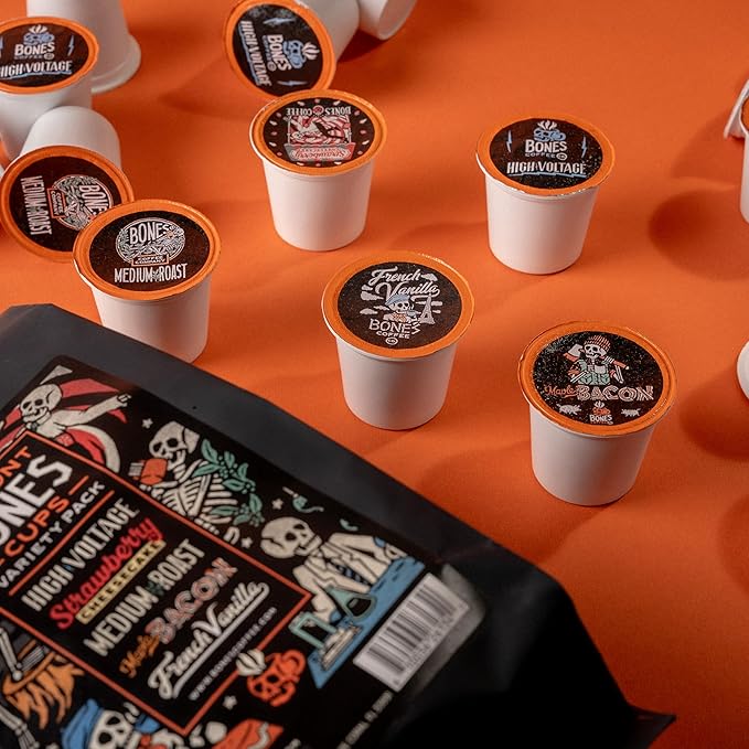 Bones Coffee Company Variety Flavored Coffee Pods, French Vanilla, Maple Bacon, Strawberry Cheesecake, Medium Roast, High Voltage Bones Cups, Compatible with 1.0 & 2.0 K-Cups Brewers, 20 Count